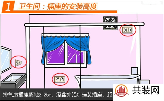 1、插座的安裝位置 有外窗時(shí),應(yīng)在外窗旁預(yù)留排氣扇接線盒或插座,由于排氣風(fēng)道一般在淋浴區(qū)或澡盆附近,所以接線盒或插座應(yīng)距地面2.25m以上安裝。距淋浴區(qū)或澡盆外沿0.6m外預(yù)留電熱水器插座和潔身器用電源插座。在盥洗臺鏡旁設(shè)置美容用和剃須用電源插座,距地面1.5m~1.6m安裝。