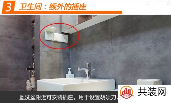 3、額外的插座 視住宅檔次或應(yīng)業(yè)主要求,還可在盥洗盆附近設(shè)置胡須刀插座及電動(dòng)牙刷或帶隔離變壓器的插座。