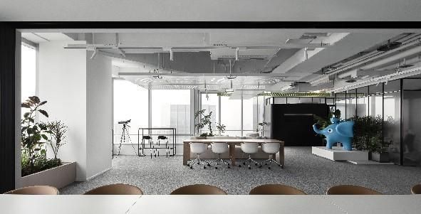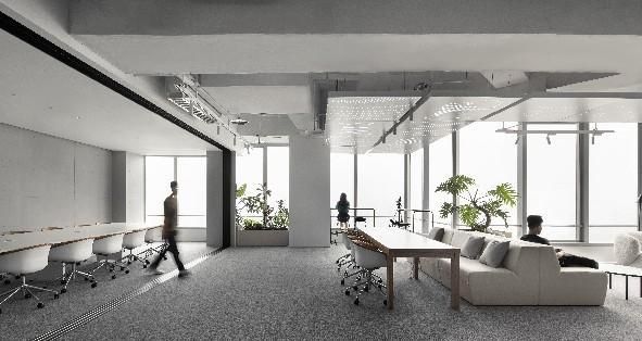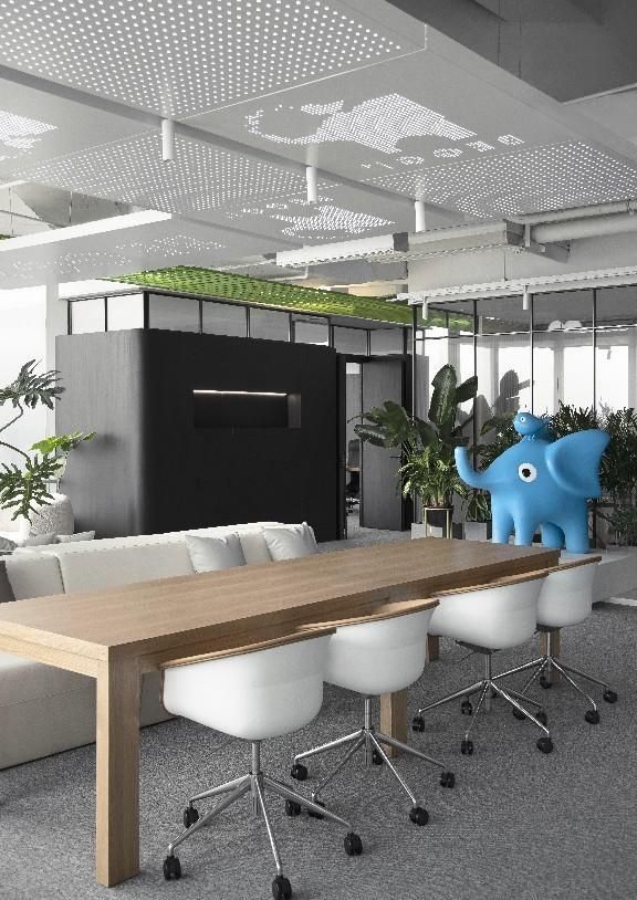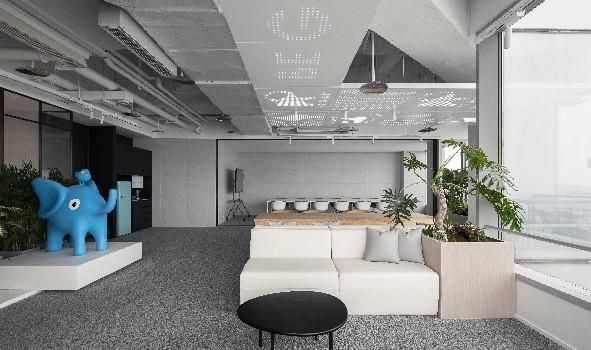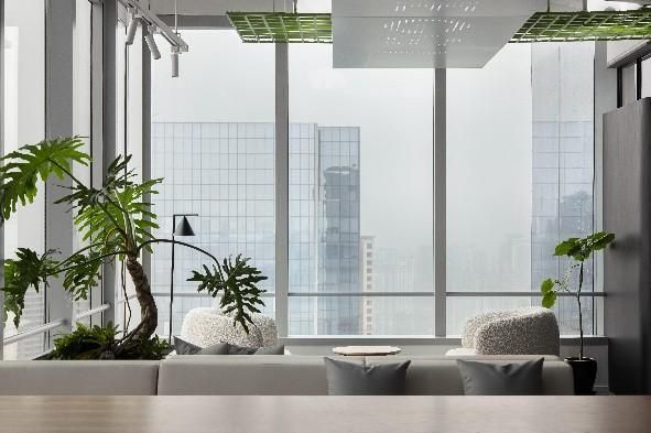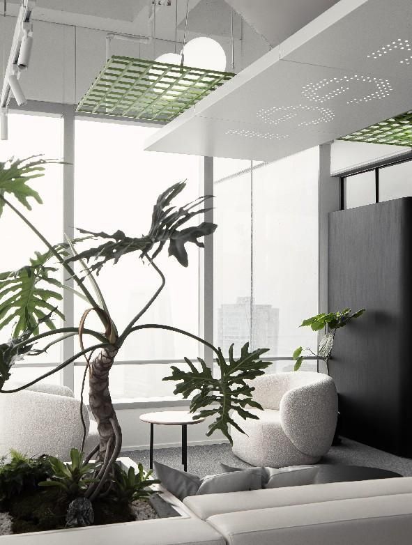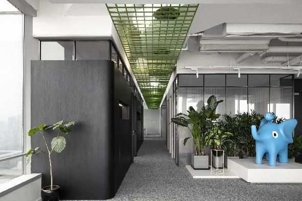 空間打造有,城市會客廳、大象吧、咖啡休閑區(qū)、無差別開放工作區(qū)及各類功能空間,通過一條貫穿各功能區(qū)的,綠色“棲廊”把各分散的空間串聯(lián)在一起。點綴于各個角落的綠植,為空間賦予了減壓、放松的氛圍感。