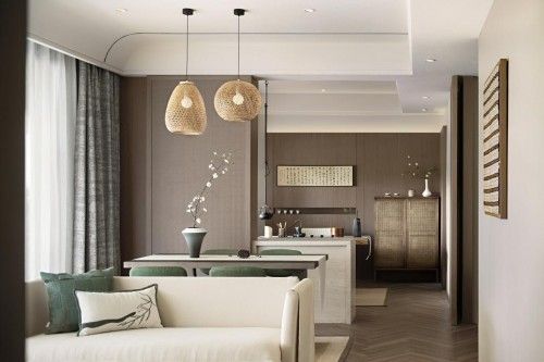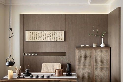 自然界的每一種現象,都與一種心靈狀態(tài)相呼應。設計捕捉這份轉瞬即逝的居家感受,重新賦予空間與生活聯系。暮色之中,人的內心不自覺進入一種疲態(tài),這時候人需要給自己一個放松的空間,去承載和包容。設計再次營造了一個令人舒適的氛圍,讓心境回歸到一個自然寧靜的狀態(tài)。 位于端頭的茶室營造了生活的悠然,一如成都人的“關上門來,白茶清歡無別事”。借暮色煮一杯清茶,夕陽西下,各自在??蛷d、餐廳與茶室,隱藏式移門設計,在整體布局上一以貫之,讓彼此隔而未隔,界而未界,空間互為聯系。