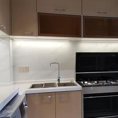 3、燈光色溫非常重要,色溫度指的是燈光照射下的物體的真實度,正常色溫越高就越冷色調(diào),但色溫并不是指燈越亮就越好。 4、為了看清楚廚房的操作臺,建議在吊柜底部按照一個射燈或筒燈,會減少我們做飯時的陰影,使用起來更加方便、安全,避免不小心切到手的危險。