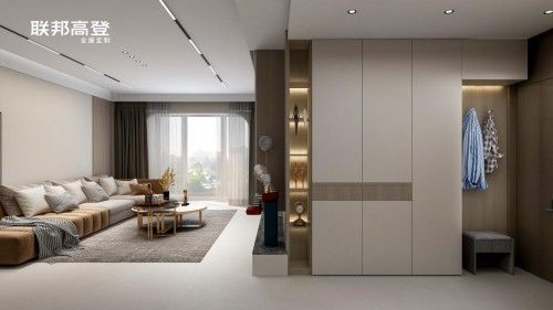 整體偏暖系的色調(diào),讓歸家之人仿佛步入秋天的童話夢境,給人滿滿撫慰,透漏著一種閑適且溫暖的感受。入戶柜設(shè)計定制部分,靠門處留空,劃分出開放式掛衣區(qū)與換鞋凳,貼心伴隨日常便捷。