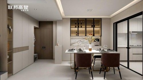 餐廚空間以透明玻璃門分隔,勾勒出不同區(qū)域?qū)傩缘碾[形分界;半藏半露展示的餐邊柜,在柜內(nèi)暖色氛圍燈帶的點綴下,營造出了格調(diào)十足的就餐儀式感。