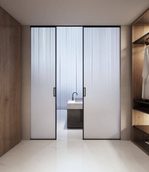 圍繞“自我”所展開(kāi)的衛(wèi)生間布置,與衣帽間連接起來(lái),打造精致利落、純粹自我的的理想衛(wèi)生間。選擇德立全景門(玻璃隔斷門),隱藏式設(shè)計(jì)將門“收”進(jìn)墻內(nèi)。朦朧柔和玻璃帶來(lái)通透唯美的視覺(jué)體驗(yàn)。