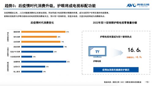 | 奧維云網(wǎng)《2022中國(guó)彩電市場(chǎng)“雙11”預(yù)測(cè)報(bào)告》預(yù)測(cè),今年雙11促銷(xiāo)期間,護(hù)眼電視零售量份額將達(dá)到16.6%,相比去年提升8.9%,成為電視市場(chǎng)的營(yíng)銷(xiāo)熱點(diǎn)。報(bào)告觀點(diǎn)基于當(dāng)下消費(fèi)者心理的變化預(yù)測(cè)而來(lái)。自疫情爆發(fā)以來(lái),人們對(duì)健康消費(fèi)的認(rèn)知更加深刻,如何減少電視屏幕對(duì)眼睛的傷害,成為當(dāng)前用戶非常在意的性能要素。能夠?qū)崿F(xiàn)畫(huà)質(zhì)與護(hù)眼功能結(jié)合的電視受到消費(fèi)者關(guān)注,防藍(lán)光電視、無(wú)藍(lán)光電視將成為雙11家電消費(fèi)新熱點(diǎn)。