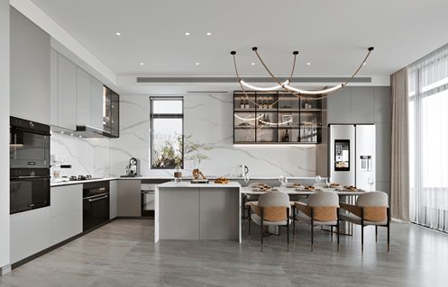 出則繁華,入則寧靜。當(dāng)下都市的喧囂,難得覓一方清凈。在某些時(shí)候人們總是渴望回歸自然,或臨近于海邊;或?qū)ひ环角逖旁鹤樱韵砬鍍簟?/p> 客廳6.3M挑空的結(jié)構(gòu),讓整個(gè)視野格外開闊,薄紗下的大開間隔斷門讓整個(gè)采光灑在客廳對(duì)的沙發(fā)上,清透春日暖陽,分外心情舒暢。一組米灰色的沙發(fā)、水墨石材茶幾、點(diǎn)睛如青黛,于花園的景致構(gòu)成一片遠(yuǎn)山近景。高視闊步,層級(jí)遞進(jìn)的藝術(shù)水晶燈更加襯托了雍容。在電視背景設(shè)計(jì)的時(shí)候,精心打造了鋁材鋼板柜開放空間,可增加點(diǎn)線面的結(jié)合,金屬元素于幾何線條僅是空間藝術(shù)的組成部分,也成為了設(shè)計(jì)語言和情感的表達(dá)媒介。 大概領(lǐng)略過精妙絕倫的自然風(fēng)景,便不會(huì)放過任何一個(gè)可以欣賞風(fēng)景對(duì)的角落,3層的品茗區(qū)在引景的手法上得到了充分的運(yùn)用。品茗區(qū)內(nèi)利用原有的結(jié)構(gòu)特點(diǎn)結(jié)合整面墻的書柜做出了一個(gè)洗手間以及茶水區(qū),暗門的運(yùn)用讓整個(gè)空間顯得合理且美觀。地面采用大面積的白色的山水紋理的巖板,山水畫簾濃淡相宜,詩書畫卷自成風(fēng)雅。一壺清茶,幾席茶座,清風(fēng)徐來,亦是精神之歸處。