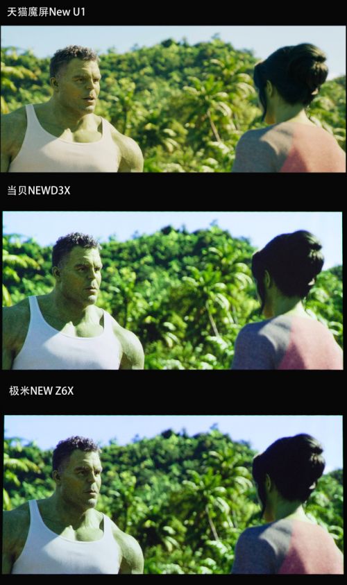 在觀影體驗(yàn)方面,我選取的測(cè)試片源為4K級(jí)別的一個(gè)劇集《女浩克》,使用這三款機(jī)器在同一環(huán)境(夜晚未開(kāi)燈、全暗環(huán)境)下做了播放測(cè)試,它們雖然是1080P分辨率的機(jī)器,但是在解析4K資源時(shí)還是挺給力的。 從上圖所呈現(xiàn)出的成像效果來(lái)看,天貓魔屏New U1的成像很明亮,而且畫(huà)面中遠(yuǎn)處的樹(shù)木在色彩過(guò)度方面的表現(xiàn)更到位,人物輪廓清晰可見(jiàn)。極米NEW Z6X和當(dāng)貝NEW D3X色調(diào)依然更偏冷色調(diào)一些。