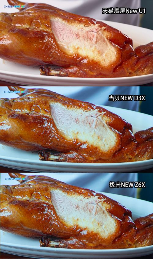 此外,我還選取了比較經(jīng)典的一個(gè)4K片源做了另一個(gè)測(cè)試,使用相機(jī)實(shí)拍了其中的一組美食鏡頭。從上面這組對(duì)比圖中,我們可以看到它們對(duì)美食畫(huà)面的表現(xiàn)也是特別到位的,尤其是肉質(zhì)的紋理特別清晰細(xì)膩。尤其是天貓魔屏New U1,食物看起來(lái)非常地誘人。 4.觀影流暢度