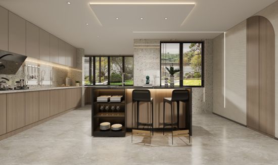 改造后:一樓西邊套 西邊套的房屋,做了擴(kuò)大化的處理,占用了一個(gè)房間的空間。客廳的位置也做了很大變動(dòng), 將樓梯的位置改成電梯。同時(shí),去客廳化,在客廳跟地下室做了聯(lián)動(dòng)。墻面也做了肌理處理,增加環(huán)境舒適度。