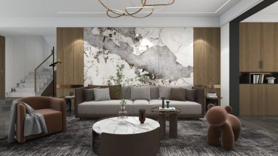 沙發(fā)背景墻運(yùn)用奧華石晶壁畫(huà)、黃栗柚搭配。在看似自然樸素的外表下隱藏著貴族的氣質(zhì)。