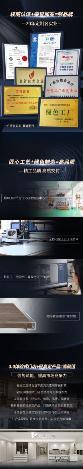 | 伴隨國內(nèi)經(jīng)濟(jì)快速發(fā)展,定制家居行業(yè)充滿變革與生機(jī),國家高度重視工業(yè)制造業(yè)的高質(zhì)量發(fā)展,家居建材行業(yè)相關(guān)政策陸續(xù)出臺,家居消費(fèi)計(jì)劃和信心迅猛提升,利好因素持續(xù)涌現(xiàn),為行業(yè)發(fā)展注入強(qiáng)勁活力,全新的市場爭奪之戰(zhàn)已經(jīng)打響。 愛閣工房作為20年廣西名實(shí)業(yè),集研發(fā)、設(shè)計(jì)、生產(chǎn)、銷售、服務(wù)及人才孵化為一體,研發(fā)實(shí)力強(qiáng)勁,擁有超40000㎡現(xiàn)代化研發(fā)制造中心,產(chǎn)品涵蓋各種風(fēng)格的櫥柜、衣柜等全屋定制家具,并逐漸延伸至沙發(fā)、寢具、門窗等硬裝、軟裝配套產(chǎn)品。品牌自成立至今,始終堅(jiān)持“精工品質(zhì) 高質(zhì)交付”,引進(jìn)德系全套生產(chǎn)設(shè)備、自動(dòng)化無塵壓貼設(shè)備,構(gòu)建高質(zhì)量的智能化生產(chǎn)體系,通過酷家樂、德國WCC等數(shù)字化平臺軟件打通設(shè)計(jì)、生產(chǎn)、交付全鏈路服務(wù)體系,為及時(shí)供貨提供強(qiáng)有力保障,相繼榮獲高新技術(shù)企業(yè)、智能工廠示范企業(yè)、綠色工廠、中國重點(diǎn)林產(chǎn)品“匠心品牌”等稱號。 愛閣工房全新3.0體驗(yàn)式門店糅合當(dāng)下潮流元素和環(huán)保材質(zhì),以最新最潮的輕高定產(chǎn)品,打造優(yōu)質(zhì)體驗(yàn)運(yùn)營氛圍,讓鄰居在沉浸式空間場景切身感受藝術(shù)家居。全+模式聚焦賦能新商,專業(yè)渠道運(yùn)營團(tuán)隊(duì)全程扶商,8大補(bǔ)貼政策扶持,12:1全案終端運(yùn)營服務(wù)支持,打造標(biāo)桿門店,業(yè)績?nèi)嫣嵘?,?shí)現(xiàn)1000萬+年銷量。目前愛閣工房全國火熱招商,誠邀優(yōu)秀新商加盟,攜手共創(chuàng)共享共贏,成就財(cái)富人生。商機(jī)無限,切莫錯(cuò)過。