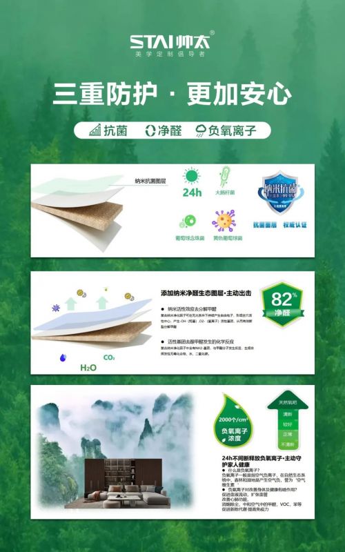 帥太品牌創(chuàng)立21載,對環(huán)保健康始終高度重視,2023年全新推出的凈醛抗菌耐馨板,打響凈醛抗菌保衛(wèi)戰(zhàn)!從環(huán)保、科技、時尚的研發(fā)理念到健康整家,從單產(chǎn)品環(huán)保到整家環(huán)保的健康維度劇變。 帥太凈醛抗菌耐馨板 引領(lǐng)家居健康革命 帥太品牌在創(chuàng)始之初就以環(huán)保、科技、時尚的產(chǎn)品研發(fā)理念,2011年帥太櫥柜推出之初,就本著為消費者打造綠色健康的產(chǎn)品,率先在櫥柜行業(yè)中推出“抗菌板”,深受消費者的熱捧!