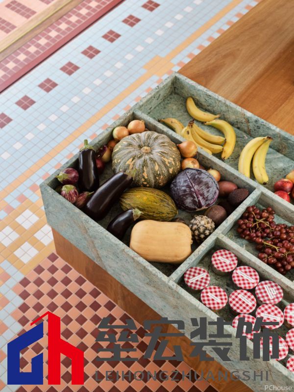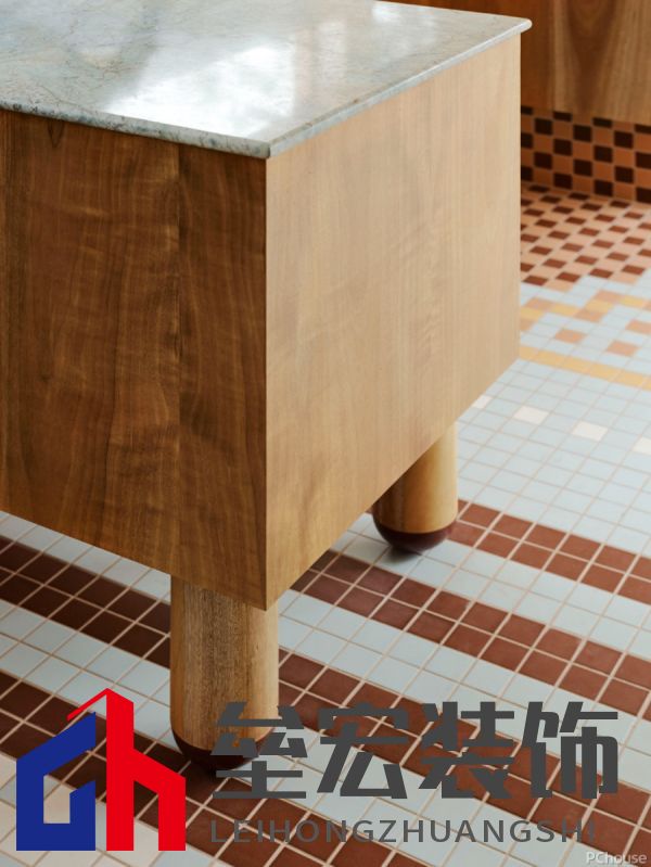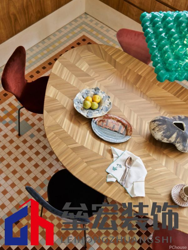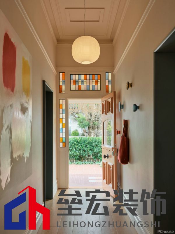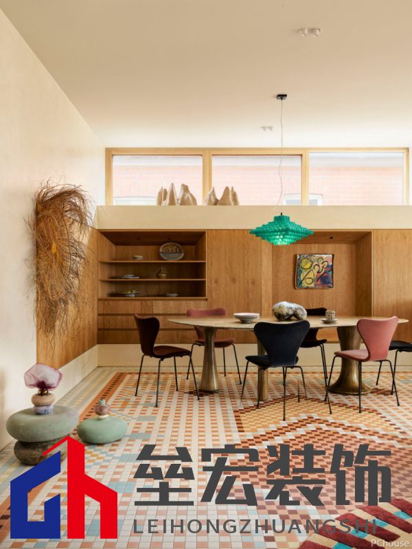 玄關(guān)是進(jìn)入住宅的第一印象,也是這所房子風(fēng)格的初步展示。入口處寶石色的鉛燈玻璃成為設(shè)計(jì)中的亮點(diǎn),賦予空間一種濃郁的異國情調(diào),并且將視覺線條引向后方擴(kuò)建部分。瓷磚圖案借鑒了波斯地毯的設(shè)計(jì),形成了一塊具有像素化效果的“地毯”,通過材料和圖案的創(chuàng)新將新舊空間連接起來,同時(shí)預(yù)示著房屋內(nèi)其他區(qū)域豐富的幾何細(xì)節(jié)。