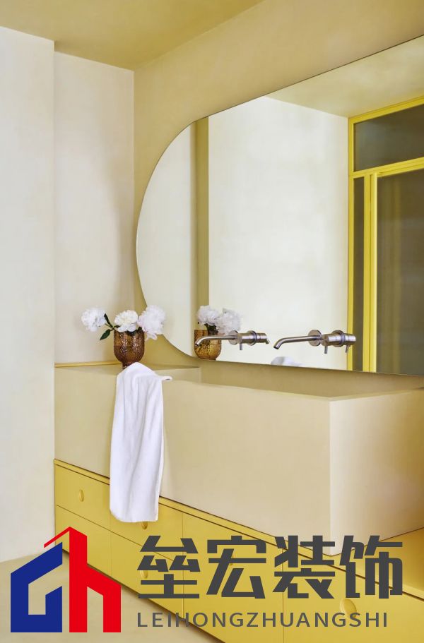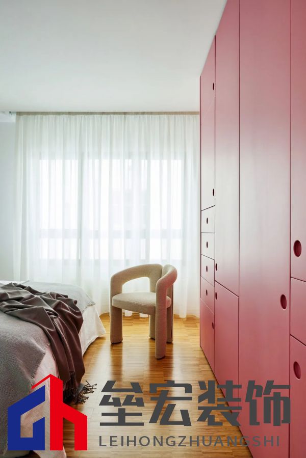 樂觀的空間。黃色的微水泥涂層、支撐在漆器容器和家具上的工藝水槽,或是同色系的隔板,都讓浴室充滿了正能量?;⌒午R子打破了直線條的單一性,增加了活力。 浸染粉紅。其中一間臥室被稱為“青少年”臥室,面積非常大,粉色家具中的雙層床可以將臥室一分為二。旁邊是Cassina的Dudet椅。