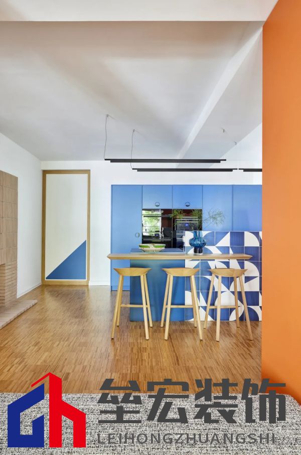 在家具之間的過道內(nèi)擺放著Marazzi公司的陶瓷作品。地板選擇了與室內(nèi)設(shè)計(jì)工作室設(shè)計(jì)的櫥柜相同的顏色。在右側(cè),島臺上擺放著Luceplan設(shè)計(jì)的Compendium燈具 “陶瓷涂層在對角線和曲線之間翩翩起舞,靈感來自亞馬遜海岸的開闊景觀”。廚房的幾何形狀和秩序。 活力四射的藍(lán)色,挑動心弦的橙色,熱情奔放的紅色,耀眼明亮的金黃……大膽的色彩搭配打造出獨(dú)具匠心、充滿活力的空間。