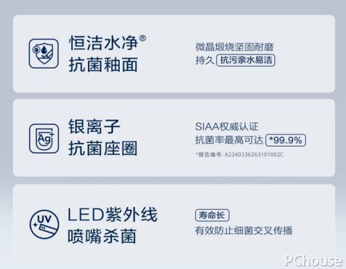 ? 恒潔水凈?抗菌釉面 微晶煅燒堅固耐磨,持久抗污 親水性強,輕松潔凈無殘留 銀離子抗菌座圈 SIAA權(quán)威認(rèn)證 抗菌率最高可達(dá)99.9% 多人共用也安心 LED紫外線噴嘴殺菌 壽命長 有效防止細(xì)菌交叉?zhèn)鞑?/p>