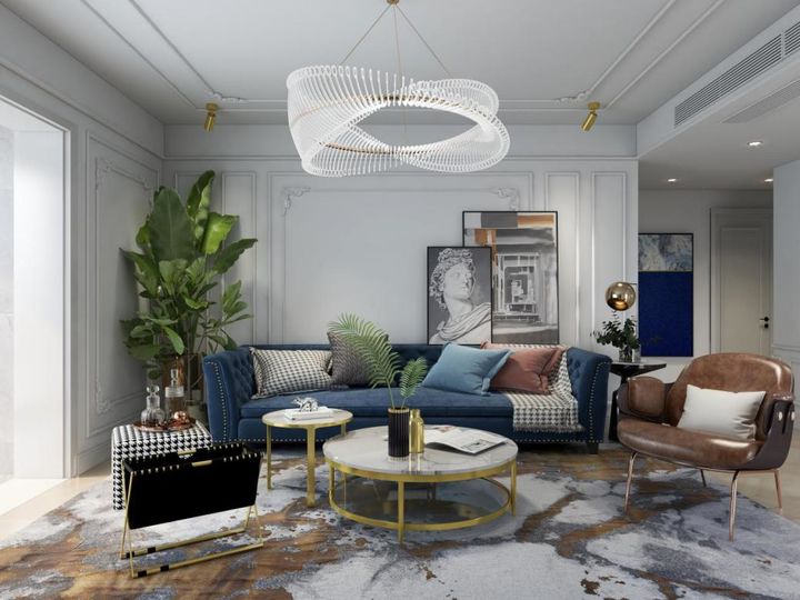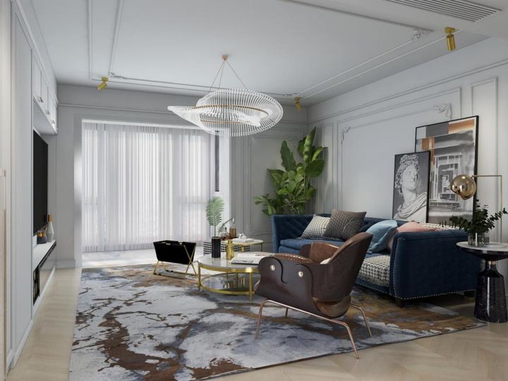 這套案例中設(shè)計師大量融入了法式風(fēng)格的設(shè)計元素,沙發(fā)背景墻的雕花線條,配上黃銅水晶吊頂燈的映襯,奢華大理石花紋地毯與深色皮質(zhì)沙發(fā)的搭配,共同營造出復(fù)古且充滿韻味的空間。