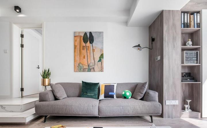 客廳主打簡約的木質(zhì)風(fēng),頂天立地的收納柜,放置書籍與藝術(shù)裝飾品。墻面除了一幅靈動的藝術(shù)畫,不再施加粉黛,塑造出一種干凈、清爽的視覺感受。