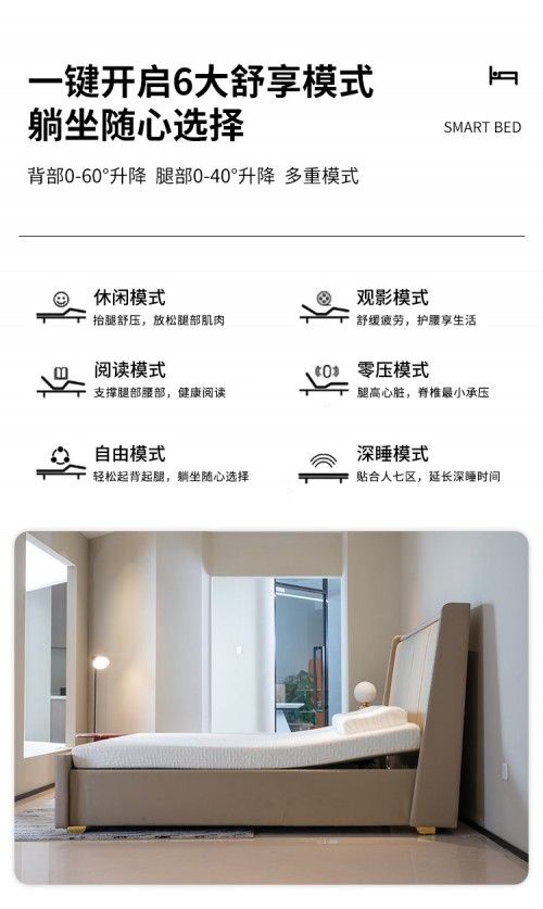 易睡戰(zhàn)略之智能化,雖然都是在床上,但不同場景的功能卻大不相同,如何能夠解決多體態(tài)的人體工程學問題,誼瑞推出六大模式智能體驗,讓消費者在不同場景享受不同貼心服務: 模式1:休閑模式:抬腿舒壓,放松腿部肌肉; 模式2:觀影模式:舒緩疲勞,護腰享生活 模式3:閱讀模式:支撐腿部腰部,健康閱讀 模式4:零壓模式:腿高心臟,減少脊椎承壓 模式5:深睡模式:貼合人七區(qū),延長深睡時間 模式6:自由模式:輕松起背起腿,躺坐隨心選擇
