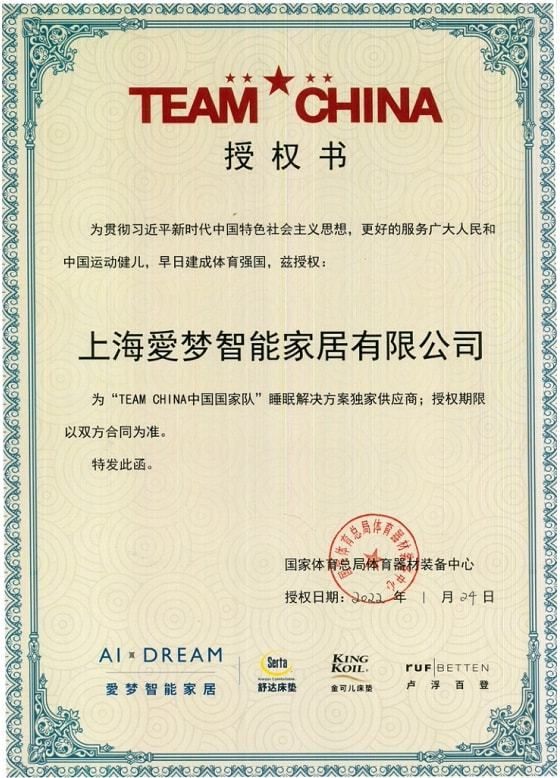 2022年1月24日,愛夢集團(tuán)攜旗下Serta舒達(dá)、KINGKOIL金可兒、RUF Betten盧浮百登三大品牌,獲得國家體育總局體育器材裝備中心授權(quán)許可,正式成為TEAM CHINA中國國家隊睡眠解決方案獨(dú)家供應(yīng)商,為70余支單項國家隊隊伍和運(yùn)動員提供智能睡眠寢具、深度睡眠解決方案。