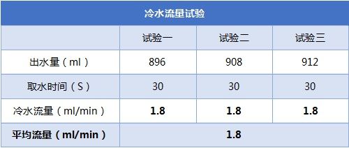 ??通過(guò)計(jì)時(shí)30s,對(duì)額定時(shí)長(zhǎng)下冷、熱出水量進(jìn)行計(jì)量測(cè)試,再換算出熱水流量,測(cè)試結(jié)果如下: