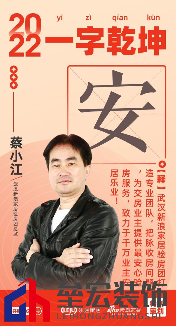 “樂業(yè)安居”是中國人最為共情之處,湖北家居人深諳漢字對于國人、對于企業(yè)的非凡意義,武漢新浪家居戰(zhàn)略合作伙伴、家居行業(yè)優(yōu)秀代表: 武漢新浪家居驗房團總監(jiān)蔡小江,以「安」字打開新年儀式感。 武漢新浪家居驗房團打造專業(yè)團隊,把脈收房問題,為交房業(yè)主提供最安心驗房服務(wù),致力于千萬業(yè)主安居樂業(yè)?!赴病棺滞昝辣磉_了2022年武漢建博會的愿景。 虎歲賁華,說好中國字,鏈接美好生活! |