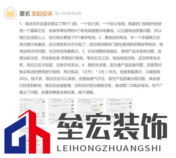 ??一位消費(fèi)者在2月19日的投訴中將自己的遭遇可以說(shuō)寫(xiě)的非常詳細(xì),他提到自己在凱迪仕品牌購(gòu)買(mǎi)了兩把門(mén)鎖,一把自用,一把給父母用,正可謂沒(méi)有對(duì)比就沒(méi)有傷害。自用的一把從安裝開(kāi)始就已經(jīng)出現(xiàn)了電量不正常的現(xiàn)象,經(jīng)過(guò)短暫的使用加之與父母使用的同款產(chǎn)品之間的對(duì)比,更加確定了產(chǎn)品本身的質(zhì)量問(wèn)題。當(dāng)然,產(chǎn)品出現(xiàn)質(zhì)量問(wèn)題是令這位消費(fèi)者苦惱的很大的原因,但更令他氣憤的則是與客服之間的溝通以及品牌在處理問(wèn)題時(shí)的效率。