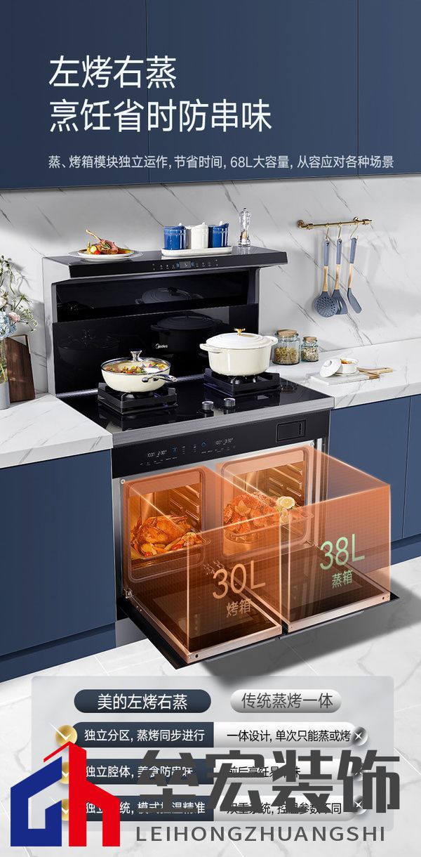在千篇一律中尋找突破,在解決方案中覓得最優(yōu)。美的新品LS5則另辟蹊徑,首次采用頂側(cè)雙吸煙口設(shè)計(jì),9+1黃金吸力分配,形成隱形油煙隔離倉(cāng),側(cè)面吸煙口率先吸走90%的油煙,頂部吸煙口再吸走10%的殘留逃逸油煙。 “上攏吸,下近吸”,黃金25-40CM低空近吸油煙+900MM寬域進(jìn)煙距離,再配合21m3/min的極速大風(fēng)量,讓油煙剛產(chǎn)生的瞬間就被阻隔和吸走,油煙吸凈率接近100%,真正做到源頭阻擊,油煙不逃逸。 第二招:雙腔蒸烤高效率的烹飪體驗(yàn) 中國(guó)人廚房普遍偏小,所以集成灶的集成屬性發(fā)揮了多種電器“合體”的功效。這也讓蒸烤一體集成灶逐漸流行。 但是從一些消費(fèi)者反饋的信息來(lái)看,蒸烤一體集成灶由于共用一個(gè)腔體,既要承擔(dān)蒸箱的勞動(dòng),還要盡到烤箱的義務(wù),容易造成食物串味,味道跑錯(cuò)“片場(chǎng)”;此外,因?yàn)椴煌巢膶?duì)于加熱功率的特殊要求,蒸烤一體集成灶烹飪效率相對(duì)更低,倘若需要較短時(shí)間內(nèi)完成多道蒸烤菜肴的烹制,有些菜就只能“排隊(duì)等待”。