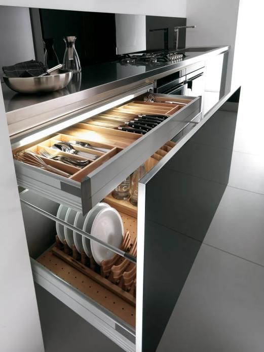 二、鍋碗瓢盆放地柜 現(xiàn)在市面上的地柜可大致劃分為掩門(mén)式和抽拉式,主要用來(lái)放置鍋具、餐具等大件廚房物品,也可以在內(nèi)嵌入洗碗機(jī)等家電。