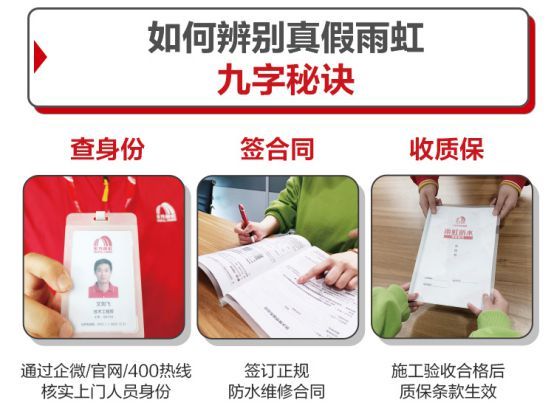 專業(yè)服務+保障 四大承諾打造差異化優(yōu)勢 “房屋漏水,就找雨虹防水維修!”,經過20多年的市場教育,東方雨虹在防水領域的專業(yè)性已是眾人皆知。從地面到墻面,從衛(wèi)生間到廚房,東方雨虹在防水維修的產品、技術、服務上沉淀了豐富的經驗。 而在專業(yè)性之外,東方雨虹還向消費者提供了全方位保障。耿剛告訴我們,東方雨虹防水維修服務承諾“材料保國標 工匠嚴篩選 價格全透明 單單有質保”。