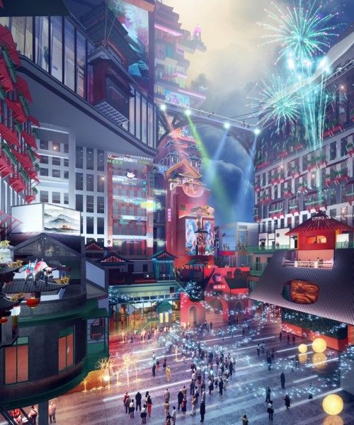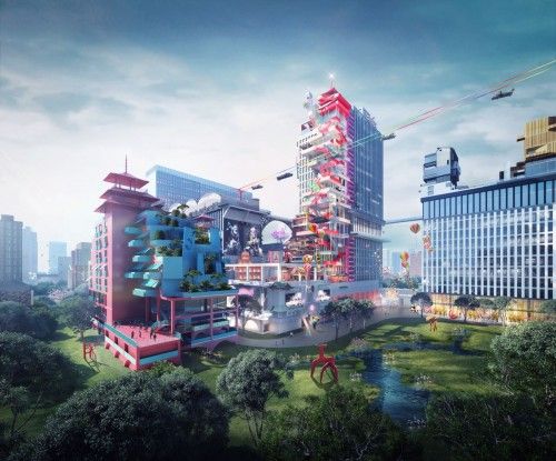 /賽博天空2077概念源自阮佳“喵喵城”(經(jīng)授權(quán)) 賽博天空2077是以2077年人類四大城邦移民火星為世界觀,在這個世界觀里,移民火星的人類為寄托對地球的“鄉(xiāng)愁”,延續(xù)血脈里的文化,將地球上最值得懷念的、美好的記憶融入了火星城邦的設(shè)計。當建筑前面加上“國潮”二字后,與其說是一種“風(fēng)格”,倒不如說是根植于中國人心中的情懷和生生不息的文化傳承。后次元國潮建筑的出現(xiàn),是對中華傳統(tǒng)建筑文化的重新審視和挖掘,蘊含著國人住居的美好愿景。