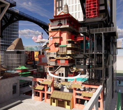 /姑蘇喵喵城局部效果圖 “姑蘇喵喵城”(賽博天空2077蘇州項目名稱)將蘇州的閶門、虎丘、滄浪亭、寒山寺、拙政園等解構(gòu)并重新設(shè)計后,折疊呈現(xiàn)在一座100米高的垂直山塘街上,文財神范蠡,西施等蘇州人物故事也在科幻化的解構(gòu)后融入到項目中去;以“美食迪士尼”為標準打造的許鮮市場則融入了許仙、白娘子和蟹王娘娘的故事,將“文化+”的理念根植于城市的記憶中,同時專門為Z世代人群打造了集吃、住、玩于一體化的沉浸式空間——21層通天塔,是一座擁有21層、高度達100米的游戲動漫綜合體,計劃引入18個超級IP和廠牌,每一層即一個IP或廠牌的全沉浸主題空間,打造成為“永不落幕的Chinajoy”。