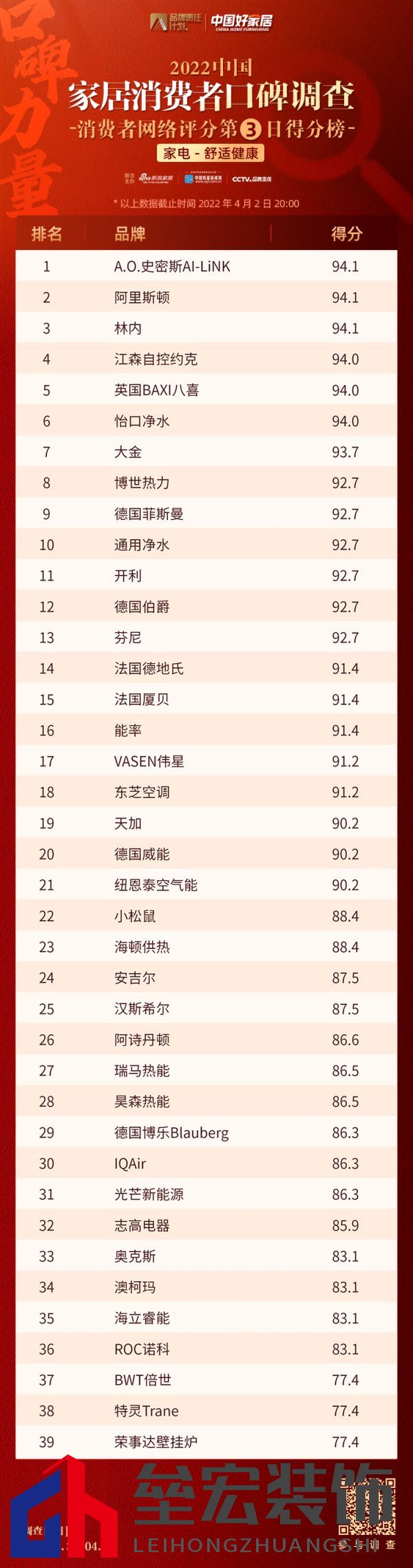 ??調查第三日,截至4月2日20時,在家電行業(yè)舒適健康品類消費者口碑榜單中,A.O.史密斯AI-LiNK/阿里斯頓/林內以94.1分并列第一,江森自控約克/英國BAXI八喜/怡口凈水緊隨其后。>>點擊查看品類得分榜單 ??此次參選家電-舒適健康品類的品牌,集中在采暖、空調、凈化器、凈水器以及舒適集成家電領域,從目前評分來看,進口品牌仍占有較大優(yōu)勢。伴隨消費升級,中央集成家電系統(tǒng),已成為家裝新剛需。譬如A.O.史密斯精心挑選核心品類,包括熱水、采暖、空調、新風、中央凈、中央軟、油煙機,集錦在集成系統(tǒng)中,通過AI-Link智能物聯(lián)平臺,讓原本是一座座孤島式的產品設備,實時根據(jù)用戶所需,自主聯(lián)動運行不同模式,創(chuàng)新實現(xiàn)場景化智能一鍵操控,創(chuàng)造新的體驗和價值。阿里斯頓提出“大升數(shù)熱水器+適配功率壁掛爐”適配性節(jié)能舒適的系統(tǒng)解決方案。以舒適和節(jié)能為出發(fā)點,以一臺適配功率的壁掛爐,搭配一臺熱水器,讓全家有溫暖的供暖空間和豐沛的熱水體驗。而作為世界綜合熱能器具專業(yè)制造商,林內始終堅持為用戶提供采暖系統(tǒng)、熱水器、廚房家電、全屋凈水等方面的專業(yè)健康生活全屋解決方案,為用戶創(chuàng)造更健康的生活方式。今日末三位為BWT倍世/特靈Trane/榮事達壁掛爐,期待這些品牌后續(xù)能直擊而上。