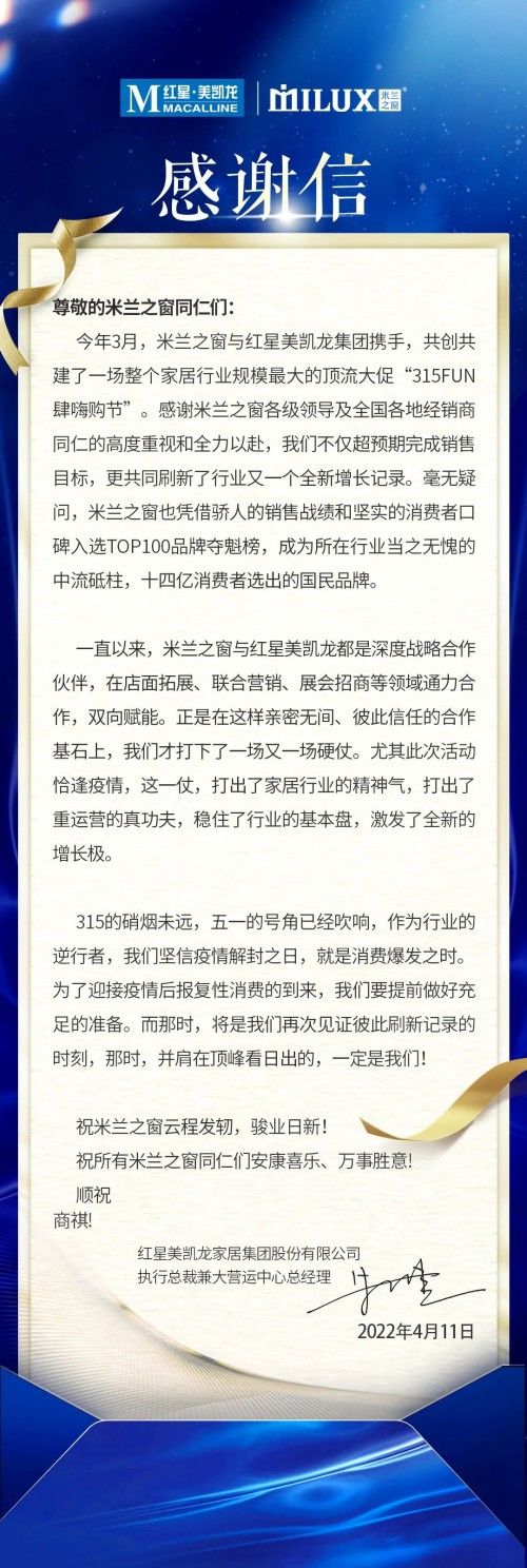 一封長達(dá)1000余字的感謝信,字里行間不僅是對戰(zhàn)略合作伙伴的肯定,更是共贏美好未來的憧憬!口碑致勝突圍市場!本次315活動米蘭之窗以同比增長48%的輝煌戰(zhàn)績交出一份完美答卷,在紅星美凱龍賣場中涌現(xiàn)25個破百萬店面、5個破二百萬店面、3個破三百萬店面!百萬級店面爭相嶄露。