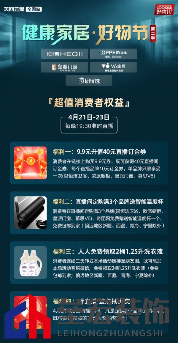 4月21日-4月23日,作為衛(wèi)浴新國貨品牌代表和智能衛(wèi)浴專家,恒潔將聯(lián)袂歐派、皇派、V6、奇團優(yōu)選等家居頭部品牌,以硬核的品質(zhì)實力、驚艷的多重福利、連續(xù)的三天直播,共同為您打造重磅級健康家居?好物節(jié)(第二季),全面升級您的居家生活新體驗! 超長三天直播,勢掀家居新國貨搶購熱浪 你來逛,我就送!一天的嗨購不過癮,那就三天,足不出戶,就將所有健康家居好物一網(wǎng)打盡。 4月21日-23日,19:30準時全國直播,主持人將與你在線互動,不僅會帶來多個健康家居好物,更帶來滿滿健康家居知識干貨,與你共度歡樂時光。 硬核品質(zhì)實力,全面守護家居健康 種草,不要套路,要認準衛(wèi)浴新國貨的硬核科技和專業(yè)守護。 恒潔Q9智能馬桶,集合了40多項國家專利,其恒凈除菌系統(tǒng),可實現(xiàn)最高達99.99%的除菌率,Q6智能馬桶,搭載水勁能沖水系統(tǒng),沖力強勁,潔凈無憂;確保如廁安全;全新恒潔R系列智能馬桶,出道即是極簡美學顏值巔峰,獨具清洗智能定位功能;恒潔HC0168DT超旋風馬桶,業(yè)內(nèi)首次實現(xiàn)3.5L沖水量,比普通6L馬桶節(jié)水40%。