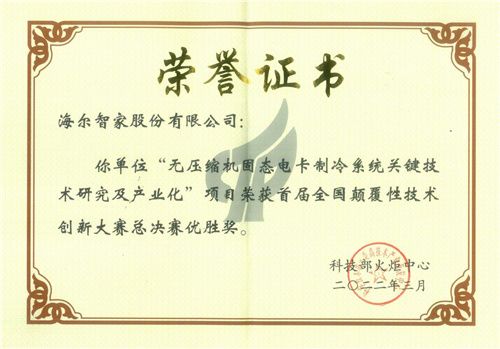 (海爾智家獲首屆全國顛覆性技術(shù)創(chuàng)新大賽優(yōu)勝獎證書)