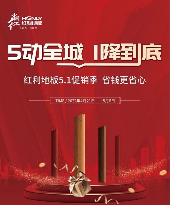 | 五一黃金周已近在眼前了,繁忙的你也終于能停下腳步了,在這個假期你有裝修的計劃嗎?如果還不知道要買什么地板,不妨來看看紅利五一有什么活動吧! 五一將至,為致敬每一個為筑就美好生活付出辛勞與努力的的平凡人,2022年4月21日-5月8日期間,紅利地板于全國各大門店舉行“5動全城,1降到底”活動,巨大折扣,超值優(yōu)惠,惠及全國!