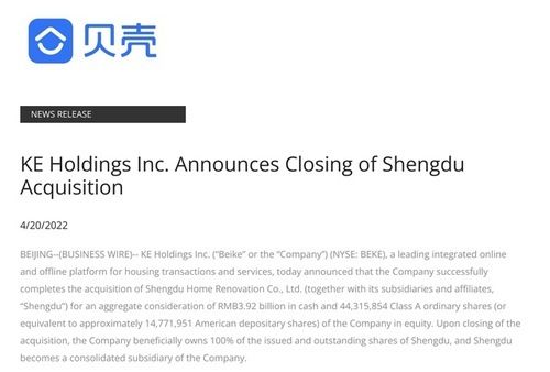 | 4月20日晚間,貝殼找房(后文簡稱“貝殼”)宣布正式完成對(duì)家裝家居品牌圣都家裝(后文簡稱“圣都”)的收購,收購?fù)瓿珊筘悮碛惺ザ?00%已發(fā)行和流通股權(quán),同時(shí)圣都正式成為貝殼的合并子公司。本次收購貝殼所花費(fèi)的總代價(jià)為人民幣39.2億元現(xiàn)金和44,315,854股公司A類普通股(或相當(dāng)于約14,771,951股美國存托股份)權(quán)益。
