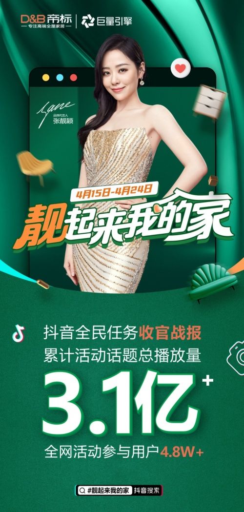 4月15-25日,帝標家居422全國置家日主題活動期間,帝標家居攜手“Doulife 家居節(jié)”、“抖音全民任務(wù)”兩大熱門IP夢幻聯(lián)動,取得了優(yōu)異的成績。其中“#靚起來我的家”抖音全民任務(wù)更是全網(wǎng)刷屏,活動結(jié)束累計活動話題總播放量高達3.1億+,全網(wǎng)活動參與用戶4.8W+,被年輕人瘋狂種草! 全平臺億級流量帝標刷屏破圈 營銷新利器加速興趣用戶消費轉(zhuǎn)化 近年來,隨著短視頻社交方式的崛起,為品牌營銷帶來全新的玩法和傳播方式,也成功拉近了品牌和年輕消費者之間的距離,其中抖音作為品牌短視頻營銷的主流陣地,結(jié)合不同形式的抖音挑戰(zhàn)賽,以有趣的表現(xiàn)形式和互動模式吸引消費者參與內(nèi)容共創(chuàng),實現(xiàn)品牌和用戶的深度交互,被視為品牌營銷的曝光利器。