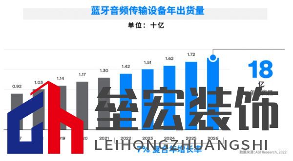預計2022年,藍牙音頻傳輸設備的出貨量達14億件。2022年到2026年,藍牙音頻傳輸設備復合年增長率為7%,到2026年年出貨量將達到18億件。 隨著人們對更大靈活性和移動性的需求增加,藍牙技術在無線耳機、無線揚聲器中的應用也將繼續(xù)擴大。預計2022年,藍牙耳機的出貨量將達到6.75億件,藍牙揚聲器出貨量將達到 3.74 億件。