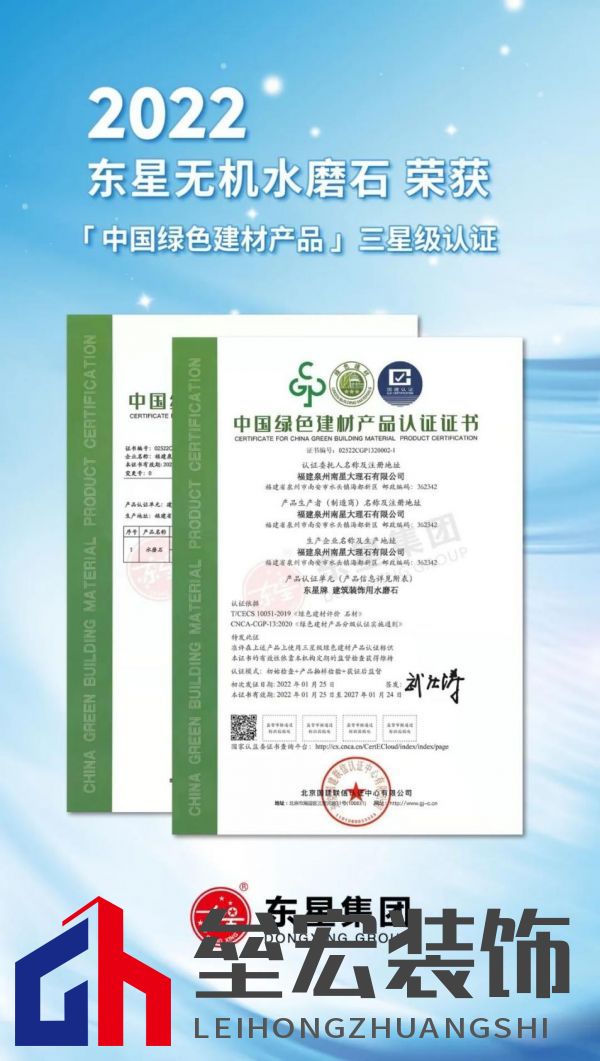 | 東星無機水磨石榮獲“中國綠色建材產品”三星級認證證書 2022年,東星無機水磨石順利通過“中國綠色建材產品”三星級認證,成為業(yè)內榮獲三星級綠色建材的水磨石企業(yè)的排頭兵。綠色建材三星標識作為國家綠色建材評價體系中的最高級別,其認證由低至高分為一星級、二星級和三星級。