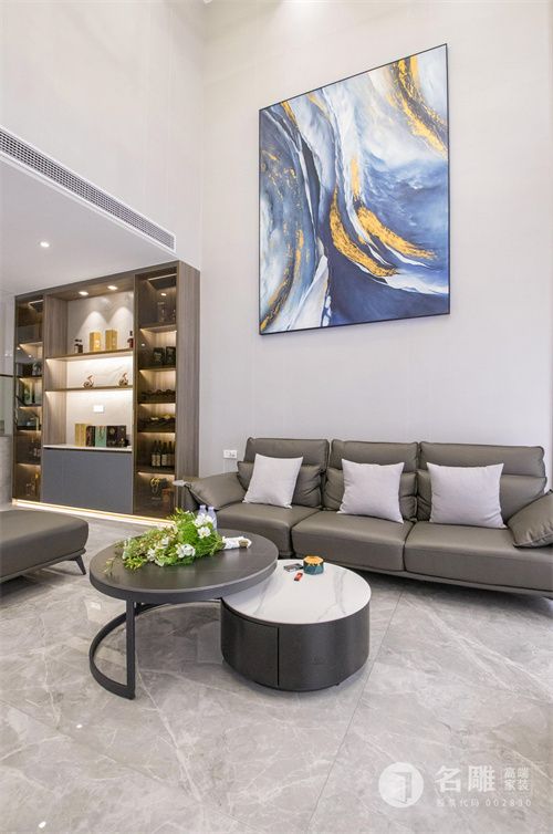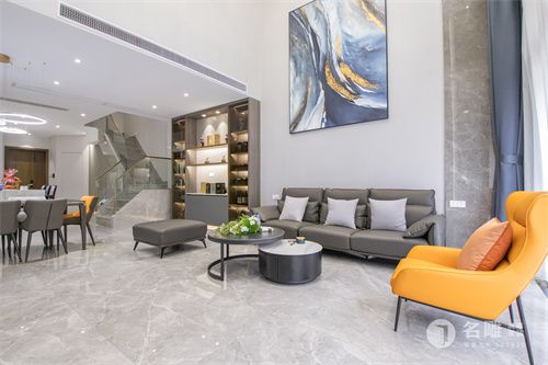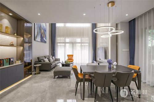 ??從入戶延伸,摒除區(qū)間邊界,以開放式姿態(tài)糅合重塑,擴大視野尺度,光透過紗簾傾瀉而下,建筑內(nèi)暖度升溫。 ??大面積留白瓷磚,灰白主調(diào)搭配同色系家具,藍色水墨背景畫和橙黃點綴其中,沉穩(wěn)不失活躍。茶幾的圓弧處理,木飾面和隱藏燈帶等,都是精心細節(jié)。 □ □ □ “ 自由、開放、愛與食光 ”
