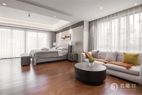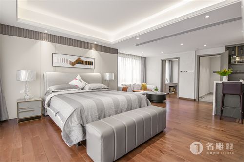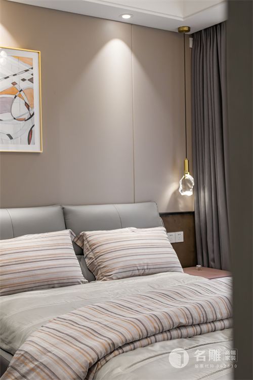 ??保持與客廳調(diào)性,主臥打造成多功能生活區(qū),集合酒水吧臺、休閑區(qū)、衣帽間,布局有序,自成天地。 ??主臥位置優(yōu)秀,陽光飽和,無主燈增添光度,床品沙發(fā)皮質(zhì)棉麻材質(zhì)作用,墻面藝術涂料印透的自然質(zhì)感,將其簡雅屬性拉至滿分,彰顯主人不俗品位。