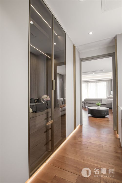 ??比起傳統(tǒng)區(qū)域封閉的硬朗,本案不設門阻隔的手法隨性自如,梳妝臺+衣帽間的過道型設計,滿足收納需求之余,空間感開闊。