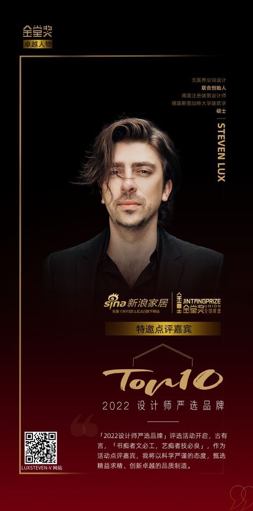 | 近日,由新浪家居聯(lián)合金堂獎(jiǎng)全國聯(lián)盟共同發(fā)起的「2022 設(shè)計(jì)師嚴(yán)選品牌 TOP10」活動(dòng),匯集了全國兩岸三地的設(shè)計(jì)大咖擔(dān)任特邀點(diǎn)評(píng)嘉賓,并邀請(qǐng)全國千余名卓越青年設(shè)計(jì)師擔(dān)任推薦官,將以設(shè)計(jì)師專業(yè)視角,甄選中國家居品質(zhì)制造。 活動(dòng)匯集國內(nèi)設(shè)計(jì)中堅(jiān)力量,范圍覆蓋百余城萬余設(shè)計(jì)師,同時(shí)32位大咖參與點(diǎn)評(píng)。以最強(qiáng)設(shè)計(jì)師陣容,甄選出服務(wù)于設(shè)計(jì)師及業(yè)主的高品質(zhì)制造品牌。STEVEN LUX擔(dān)任「2022 設(shè)計(jì)師嚴(yán)選品牌TOP 10」特邀點(diǎn)評(píng)嘉賓。
