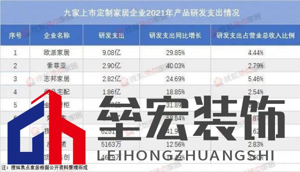 | 2022年廣州定制家居展剛結(jié)束不久,展會(huì)現(xiàn)場(chǎng),10000+款新產(chǎn)品遍地開花,在這場(chǎng)盛況空前的產(chǎn)業(yè)圖景下,“提升產(chǎn)品競(jìng)爭(zhēng)力”作為各定制企業(yè)的發(fā)展共識(shí)。  隨著更年輕的一代成為家居消費(fèi)主力,審美與消費(fèi)觀念尤為豐富多樣,產(chǎn)品也在不斷升級(jí)與迭代,為了實(shí)現(xiàn)差異化競(jìng)爭(zhēng)優(yōu)勢(shì),近年來各定制家居企業(yè)普遍強(qiáng)化產(chǎn)品力的建設(shè)。針對(duì)2021年9家定制家居上市企業(yè)的研發(fā)投入、業(yè)務(wù)布局等,搜狐焦點(diǎn)家居整理分析。  一、歐派家居 公開資料顯示,2021年歐派研發(fā)人員的數(shù)量超過2900人,研發(fā)支出9.08億,同比增長(zhǎng)29.85%,研發(fā)支出占營(yíng)業(yè)收入比例4.44%。年度研發(fā)投入在上市的九家定制家居企業(yè)中居首位。 歐派家居將產(chǎn)品研發(fā)擺在重要的戰(zhàn)略地位,堅(jiān)持用設(shè)計(jì)為企業(yè)賦能,在廚柜、衣柜等業(yè)務(wù)板塊都設(shè)有產(chǎn)品研發(fā)部門,目前的產(chǎn)品開發(fā)已從單品類過渡到全屋定制,實(shí)現(xiàn)了柜門墻配一體化設(shè)計(jì),用高度和諧統(tǒng)一的色彩搭配詮釋現(xiàn)代家居美學(xué)。