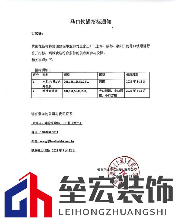 | ??紫荊花涂料(上海)有限公司發(fā)布最新招標信息,對三家工廠(上海、成都、惠陽)的馬口鐵罐進行公開招標,誠邀全國各大優(yōu)秀供應商參與投標!