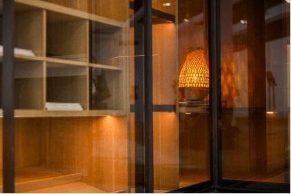 搭配上歐茶色的玻璃移門,讓整個(gè)空間藝術(shù)的氛圍感更濃烈了幾分,在凸顯出柔和細(xì)膩氛圍的同時(shí),也呈現(xiàn)出簡練有力的線條,一強(qiáng)一弱的細(xì)節(jié)搭配,既烘托出強(qiáng)烈的主題氛圍,又能釋放空間的豐富性。