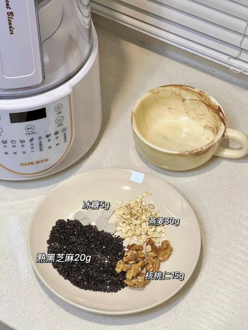 ??黑芝麻核桃燕麥奶 ??食材:黑芝麻20g、核桃仁15g、燕麥30g、冰糖5g、水500ml ??做法:核桃仁清洗干凈,瀝干水分備用;黑芝麻淘洗干凈,瀝干水分備用;將核桃仁以及黑芝麻、燕麥和水放入奧克斯破壁機(jī),選擇豆?jié){功能,功能完成后放入冰糖選擇破壁功能攪打10秒左右即可。(長(zhǎng)期堅(jiān)持食用便可以起到養(yǎng)發(fā)、烏發(fā)的作用。)