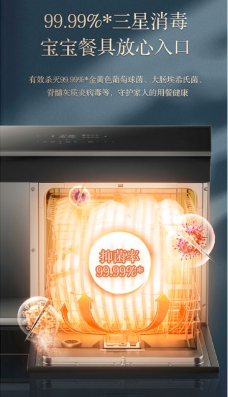 ??而美的飛檐XH10集成洗碗機不僅節(jié)省了您做家務(wù)的時間,更在清洗、烘干、消毒、存放抑菌方面有多重專業(yè)設(shè)計。令洗碗機達(dá)到行業(yè)最高的三星消毒標(biāo)準(zhǔn)。